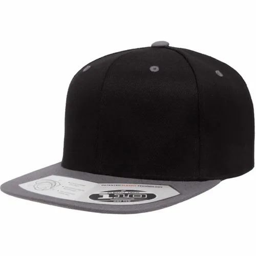 83% Acrylic/15% Wool/2% PU Spandex White – 98% Acrylic/2% PU Spandex Structured, Six-panel, High-profile, 3 3/4″ Crown Flat Bill, Moisture-wicking Sweatband Contrasting Eyelets on Two-tones Adjustable + Flexfit® Tech Snapback Closure