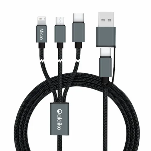 This sleek braided 3-in-1 charging cable covers all Smart Phones on the market. Featuring a Type-C input and MicroUSB, Type-C USB, and 8-pin style output connectors! Connect Reach supports simultaneous charging for 3 devices, all combined in one power cord. This extra-long, durable, and stylish cable will charge all your devices while you are on the go or at home.