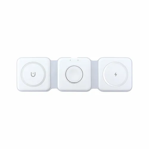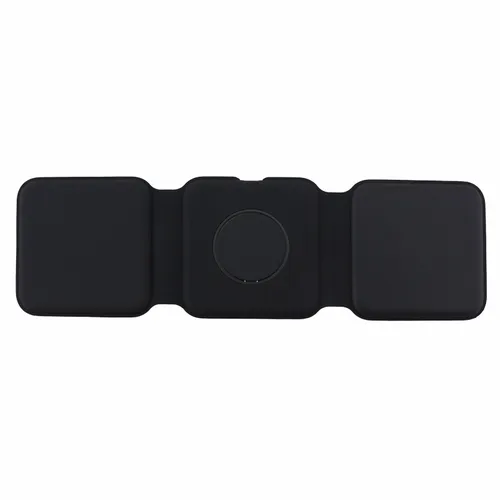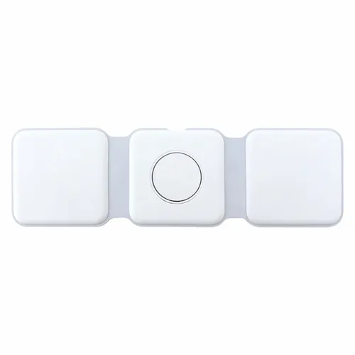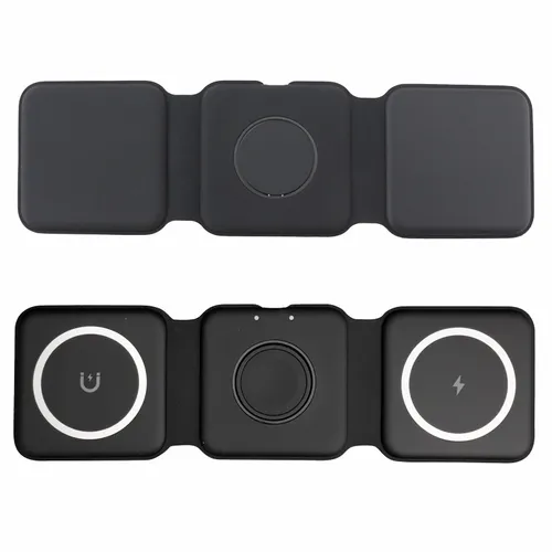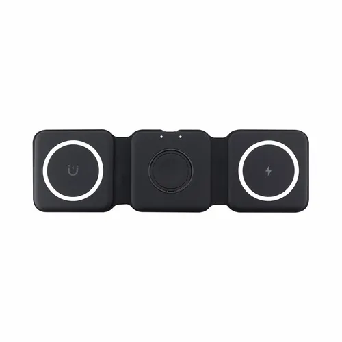 A travel kit for busy business teams that travel and need to keep multiple devices charged. It comes with our new Chi-Charge Stack(#2176, exclusively patented) that wirelessly charges a phone, Apple Watch, and AirPods, plus a USB-C and USB-A AC adapter(#2181) that comes with a Type-C power cord. Simply plug into a reliable power source and charge all three devices. Left Charging Pad: Apple or Android phones/Middle Charging Pad: Apple watch only/Right Charging Pad: Airpods or another phone.