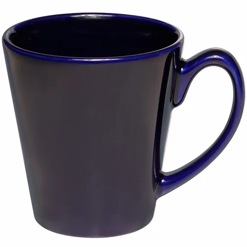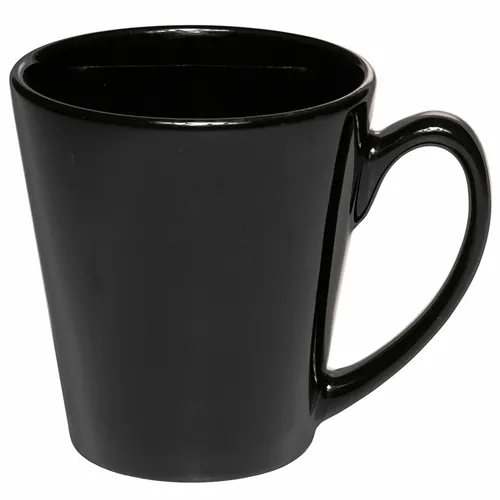 Latte Promotional Logo Coffee Mugs with a Unique Shape. Smooth Molded Ceramic Composite. Glossy Vibrant Color Exterior Finish. High Curved Grip for Easy Grab-n-Go Handling. Recommended Hand Wash Only