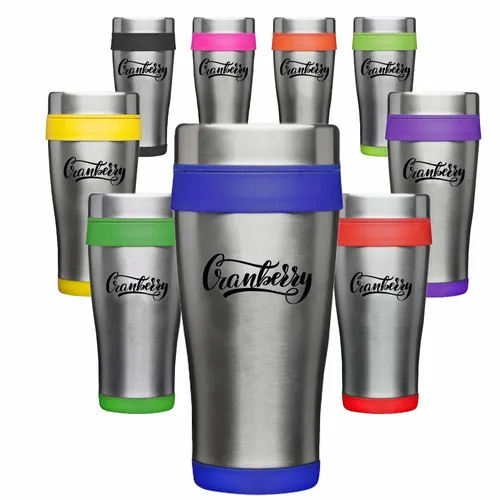 Note : Laser Engraved is available on Front Side only Capacity and Material: 16 oz | Plastic/Steel Imprint Area:2.5" W x 1.75" H Cup Width:3.25" Cup Height:7"