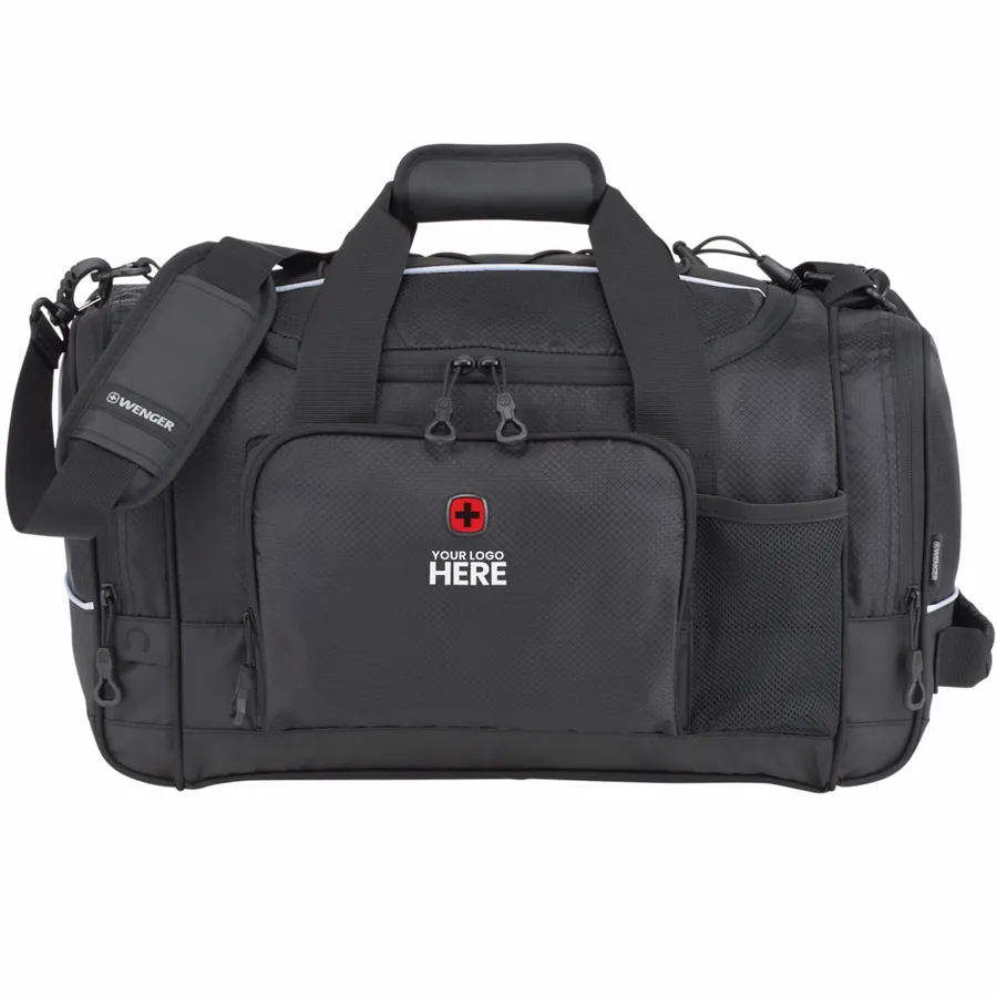 The Wenger Apex 20 RPET Sport Duffel is rugged enough for all of life's adventures, not to mention super roomy! This durable duffel bag features a spacious main compartment, plus two large zip pockets, a front pocket and a mesh water bottle pocket. Perfect for carrying your workout clothes, travel gear, toiletries and more. A front organizer zip pocket is ideal for keys, smartphone, ID, pens, and pencils while a bungee-cord system can cinch an extra pair of shoes and other equipment.