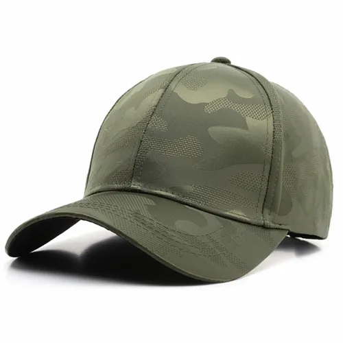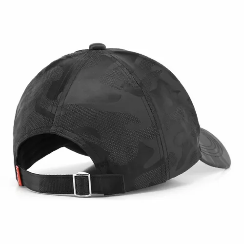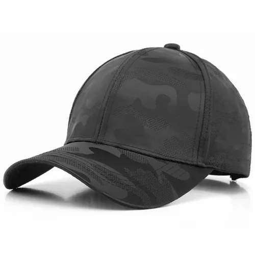 This type of hat is made of polyester material and features a dark camouflage pattern. Like a traditional baseball cap, this type of hat features a curved brim or visor at the front to help protect the wearer's eyes from the sun, and it is often adjustable to fit different head sizes.
