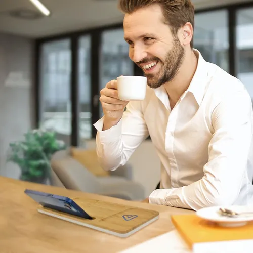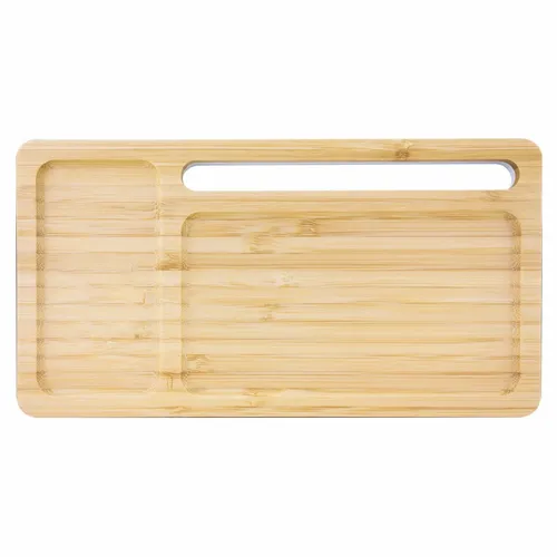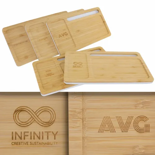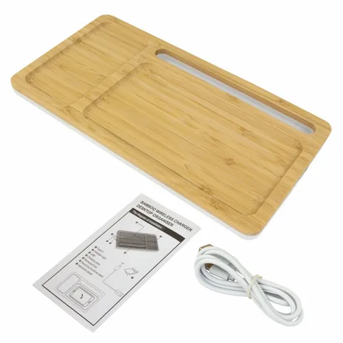 It's a bamboo-topped desktop charging phone tray. It will help maintain a tidy desktop, wirelessly charge a phone, and has an additional spot for business cards. The long and narrow groove is a convenient space to prop up a phone. It has a large visual space for branding and the natural color and modern design will match well with an office environment that is bright with life.