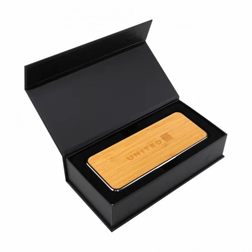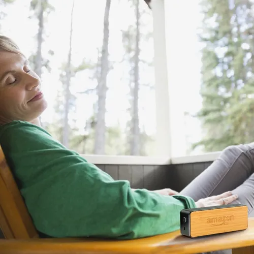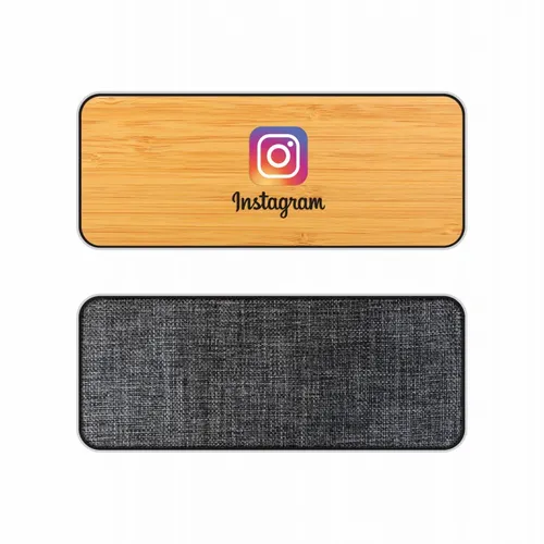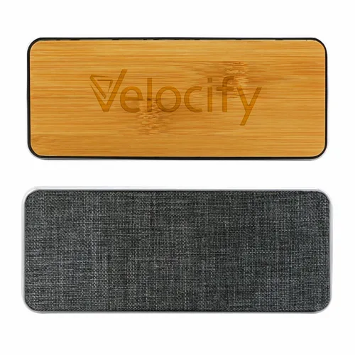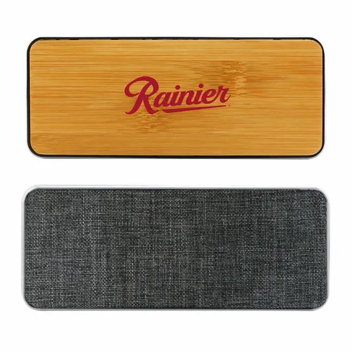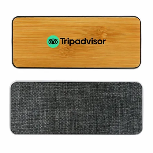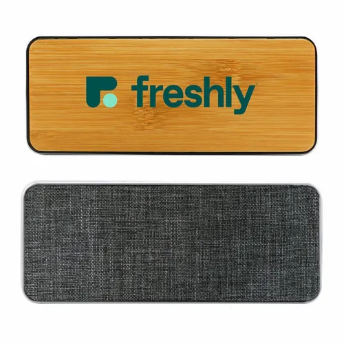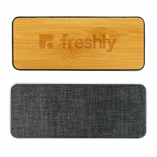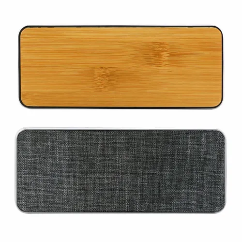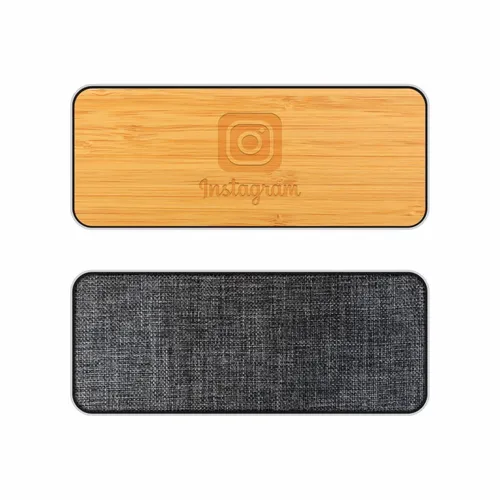 Chic wireless speaker with bamboo decoration area provides a clean look and great sound. Print or engrave the bamboo surface to promote your event or message! Packed in gift box packaging.