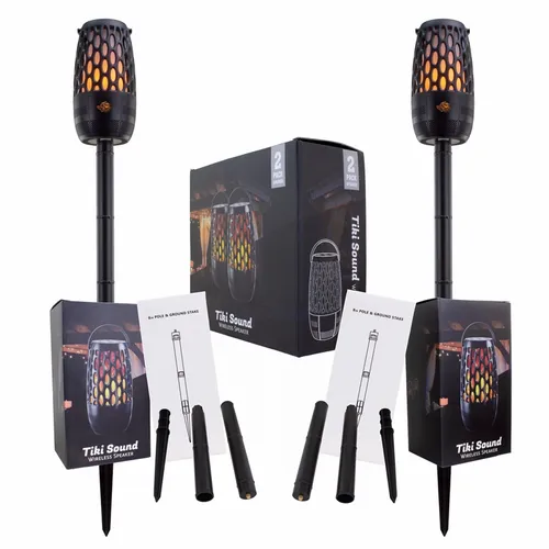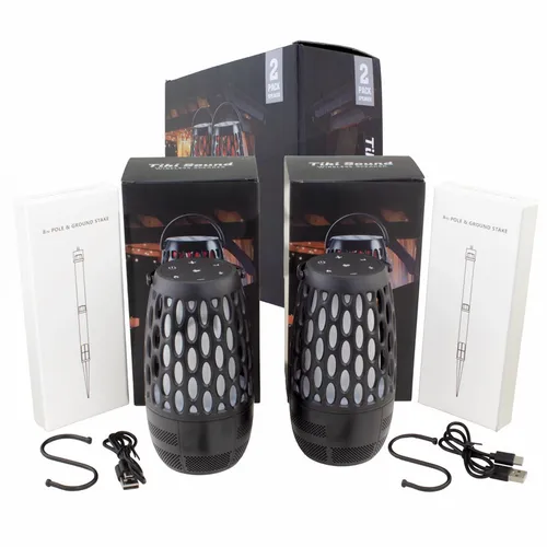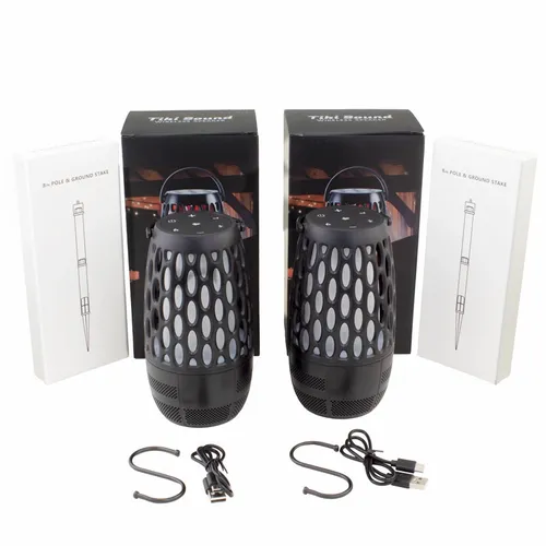 A fun pair of wireless speakers with different lighting modes and built-in sounds. Each has a handle, to easily suspend on a hook, and an attachable pole for placing them to the ground. When paired together, they support a True Wireless Stereo (TWS) function.
